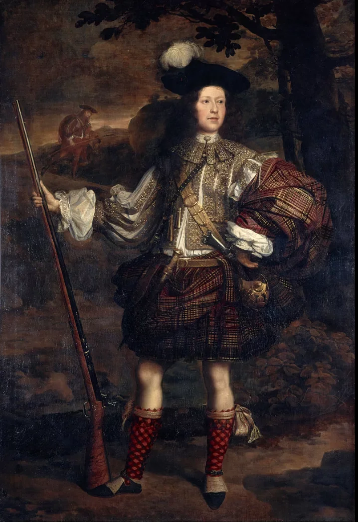 This picture shows a Highland chieftain wearing one of the earliest kind of Scottish kilt, the belted plaid, in 1680.